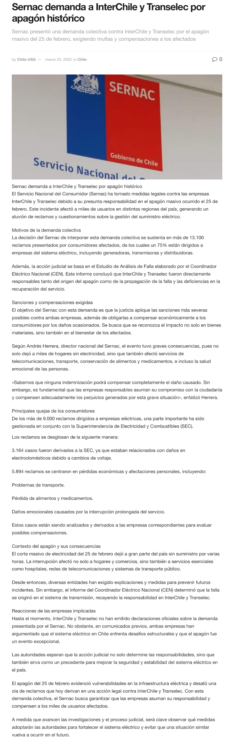 SERNAC demanda colectivamente a empresas eléctricas causantes del mega apagón de febrero pasado - (ceinoticias.cl)