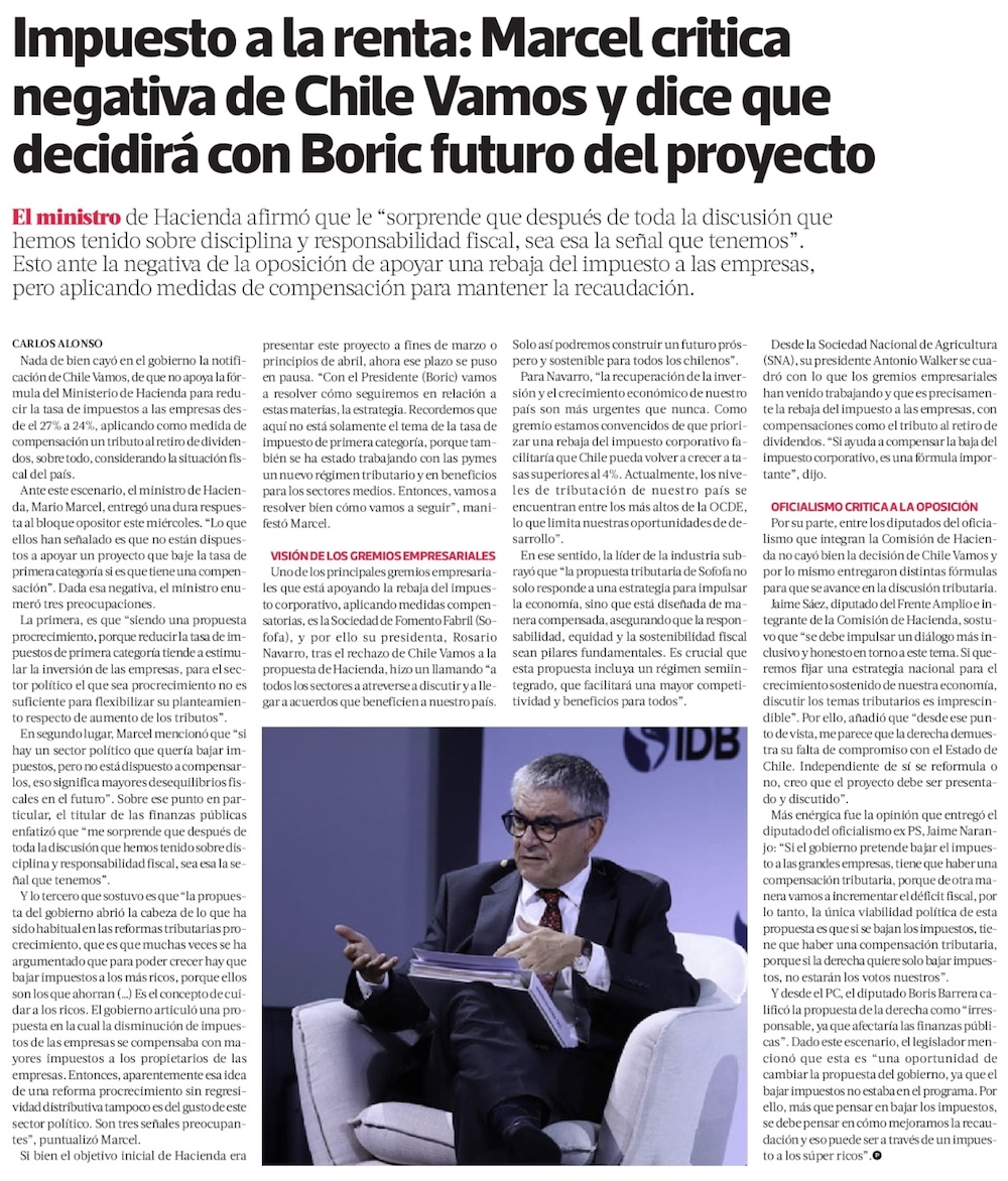 Impuesto a la renta: Marcel y Boric analizarán alternativas tras nuevo portazo de la oposición - (Diario Financiero)