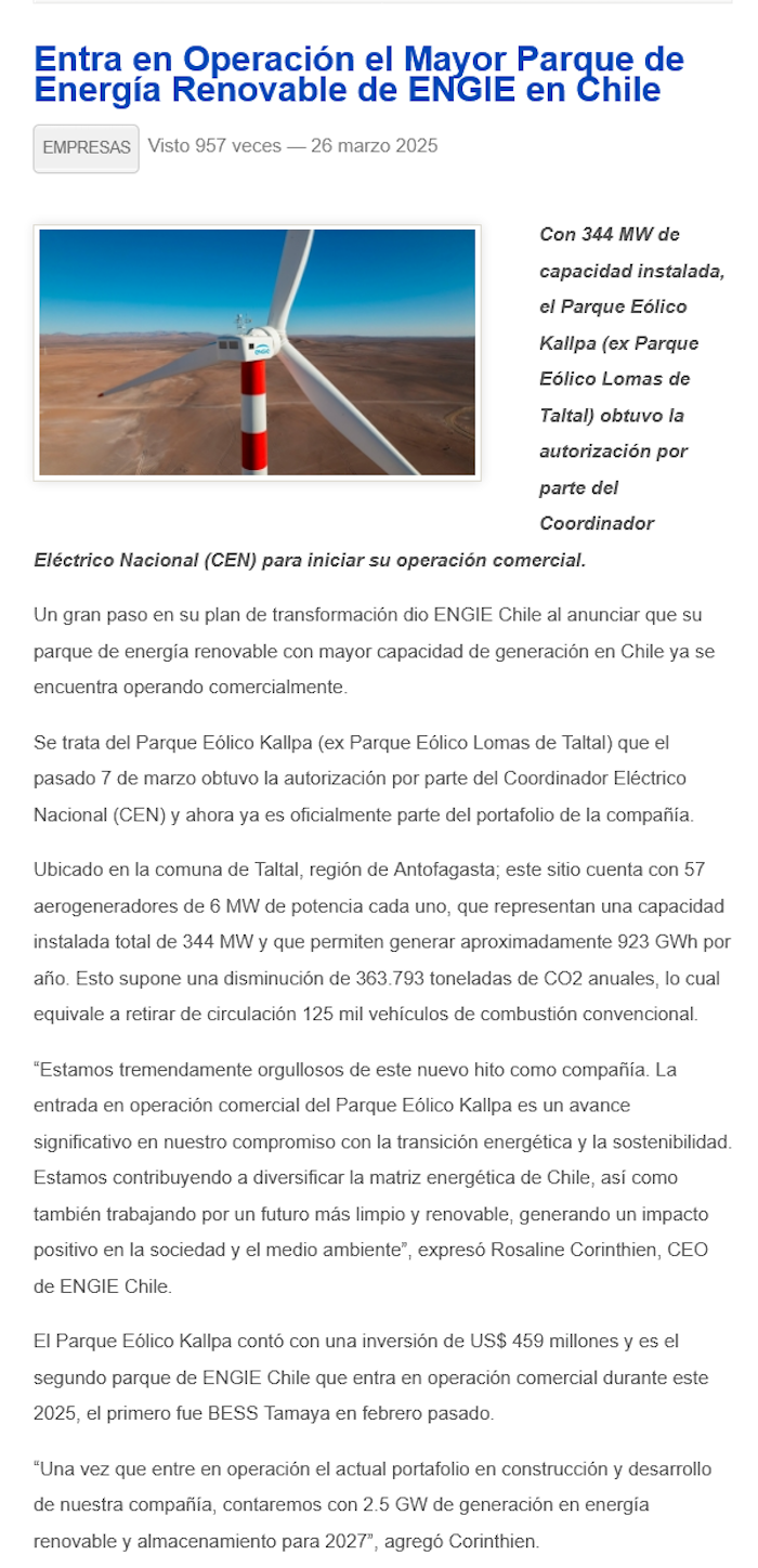 En Taltal entra en operación el mayor parque de energía renovable de ENGIE en Chile - (La Estrella)