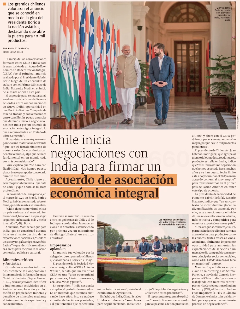 Boric inicia negociación con India para alcanzar un amplio acuerdo comercial - (La Tercera)