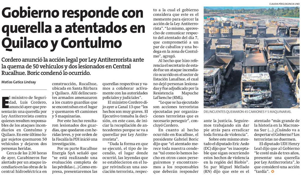 Gobierno anuncia querella por Ley Antiterrorista por ataques incendiarios en Rucalhue y Contulmo - (Diario Concepción)