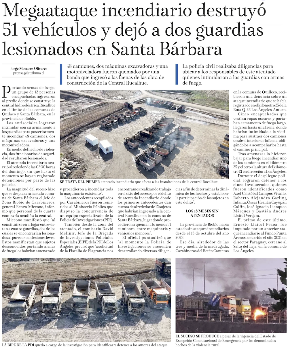 Biobío: ataque en central Rucalhue deja más de 50 máquinas destruidas - (La Tercera)