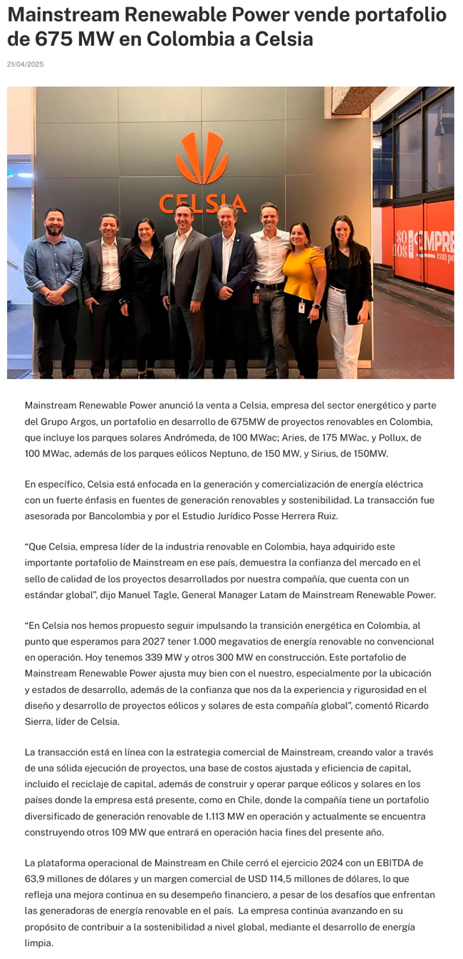 Mainstream Renewable Power vende cinco proyectos renovables al Grupo Argos en Colombia - (Diario Financiero)