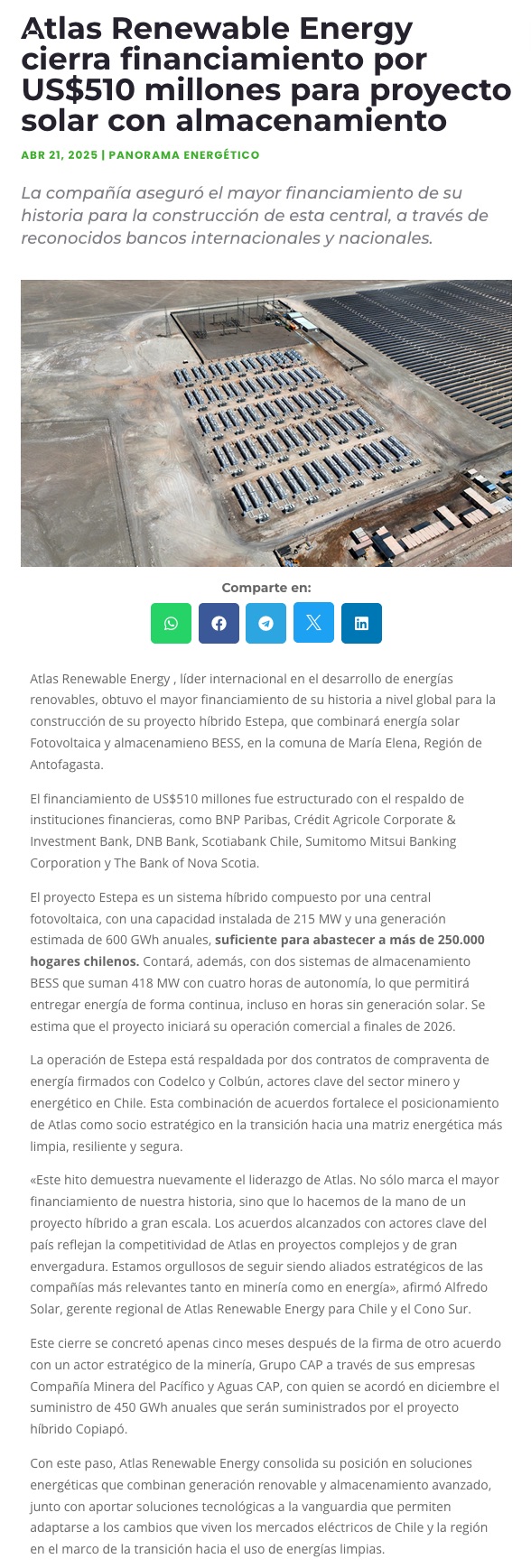 Atlas Renewable Energy cierra financiamiento por US$ 510 millones para proyecto híbrido en la Región de Antofagasta - (portalminero)