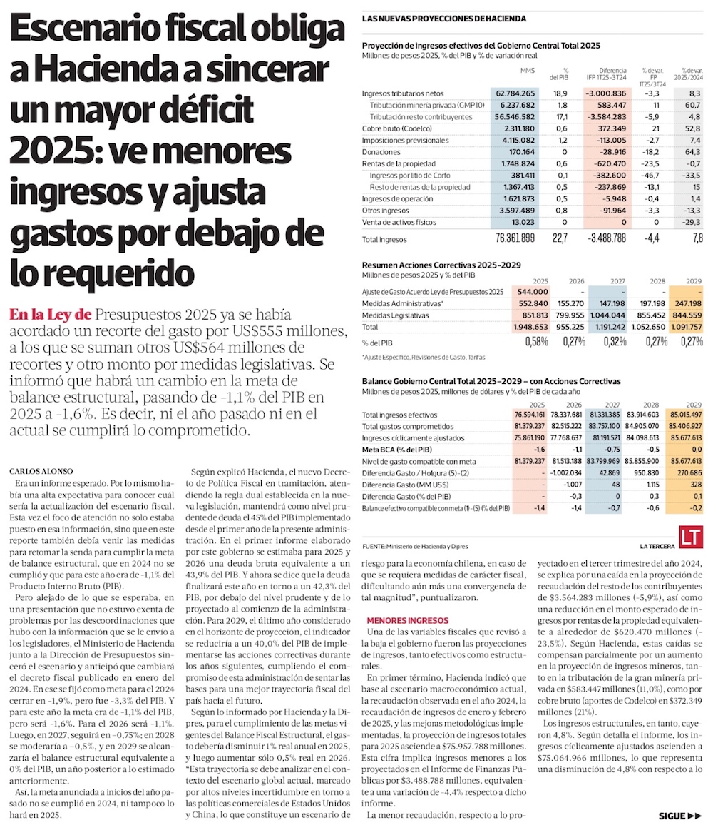 Hacienda incumple de nuevo la regla fiscal y proyecta que próximo gobierno deberá hacer ajustes al gasto - (El Mercurio de Santiago)