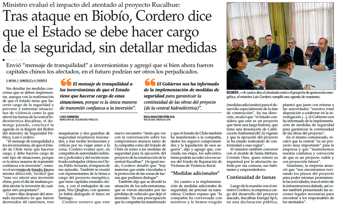 Cordero promete más seguridad para central Rucalhue y manifiesta preocupación ante inversionistas chinos - (Diario Financiero)