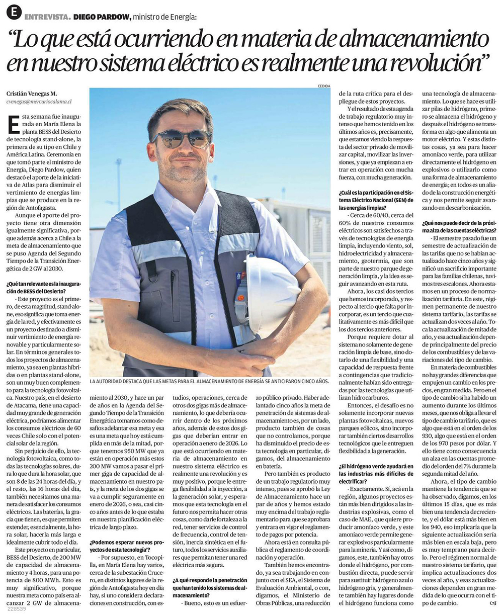 "Lo que está ocurriendo en materia de almacenamiento en nuestro sistema eléctrico es realmente una revolución" - (El Mercurio de Calama)