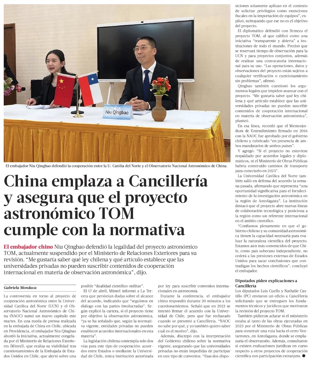 Embajador Niu Qingbao sale a defender posición en Chile: “Desde EEUU han difamado los proyectos con inversión china” - (Diario Financiero)