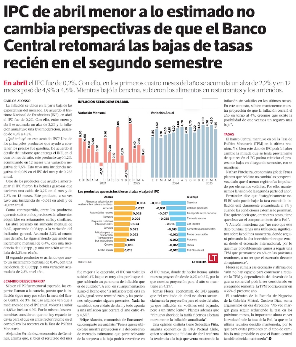 Alza del IPC menor a la esperada en abril refuerza apuestas de inflación en 4% a diciembre y una baja de tasas en junio - (Diario Financiero)