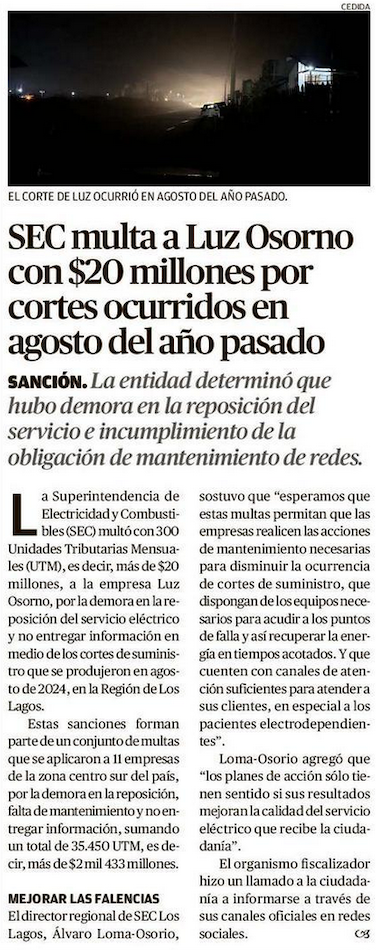 SEC aplicó multas por más de $200 millones a empresas por tardía reposición de servicio - (El Austral de Los Ríos)