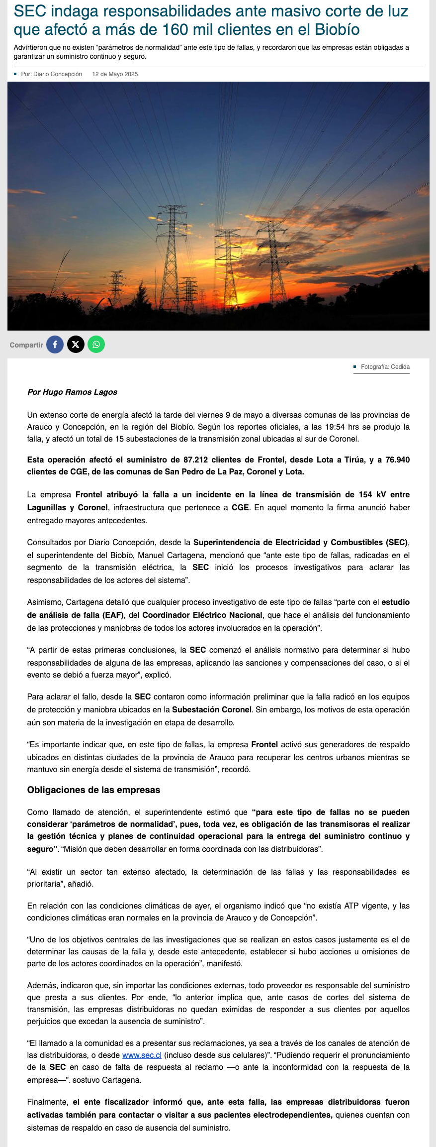 Superintendencia indaga responsabilidades por masivo corte de luz que afectó a más de 160 mil clientes en el Biobío - (tvu.cl)