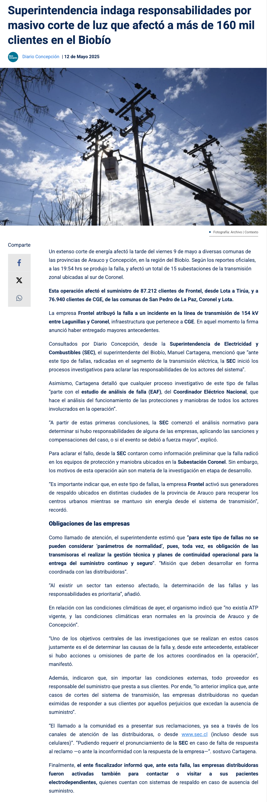 SEC indaga responsabilidades ante masivo corte de luz que afectó a más de 160 mil clientes en el Biobío - (diarioconcepcion.cl)