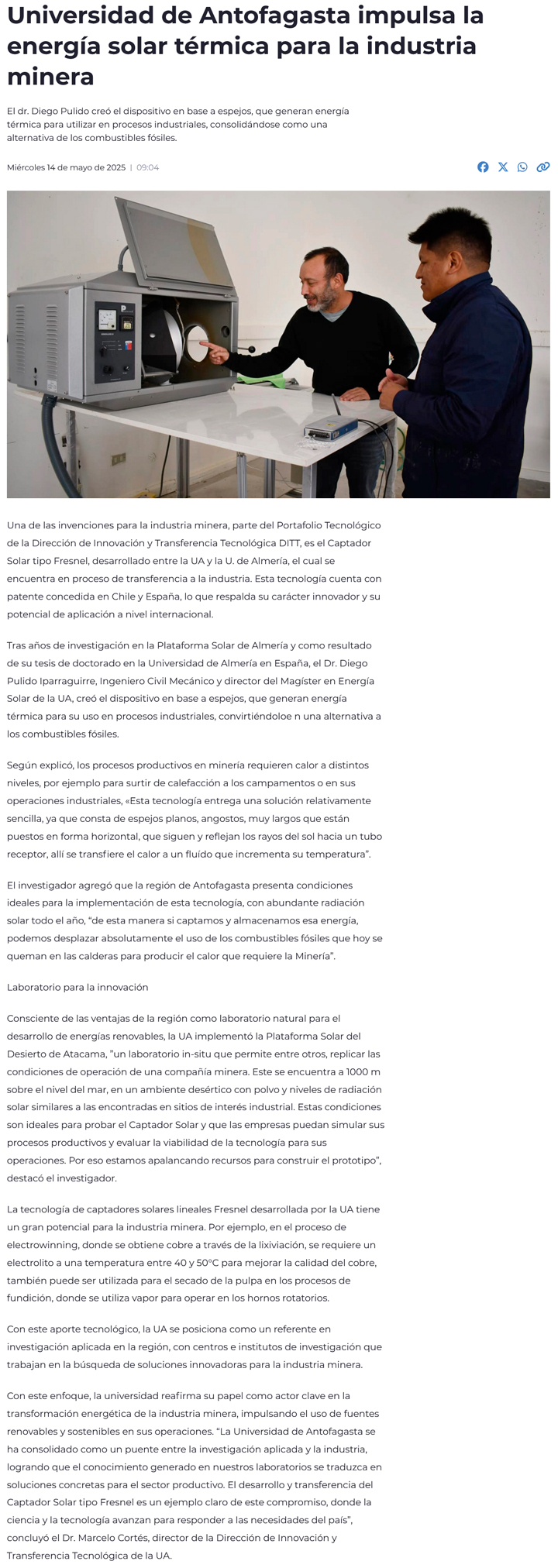 UA impulsa la energía solar térmica para la industria minera - (El Mercurio de Antofagasta)