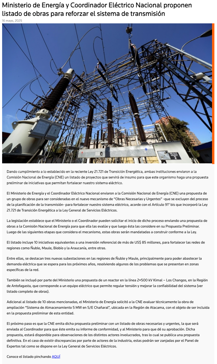 Ministerio de Energía y Coordinador Eléctrico Nacional proponen listado de obras urgentes y necesarias para reforzar el sistema de transmisión - (revistaei.cl)