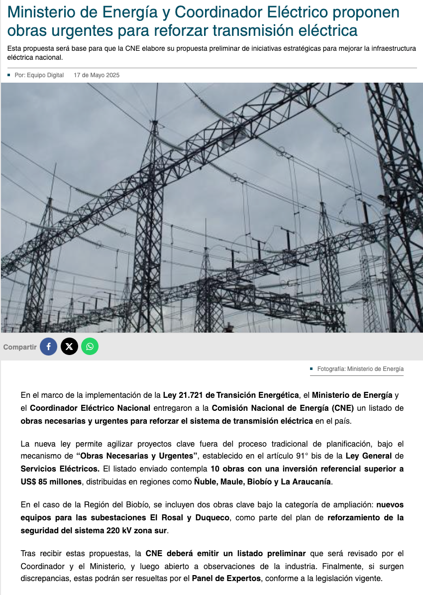 Ministerio de Energía y Coordinador Eléctrico proponen obras urgentes y necesarias para reforzar transmisión - (electromineria.cl)