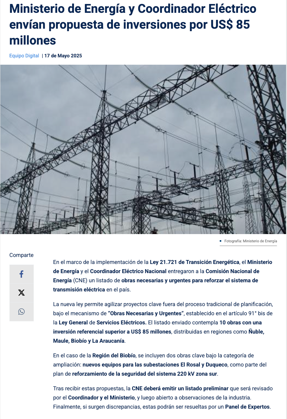 Ministerio de Energía y Coordinador Eléctrico proponen obras urgentes para reforzar transmisión eléctrica - (diarioconcepcion.cl)