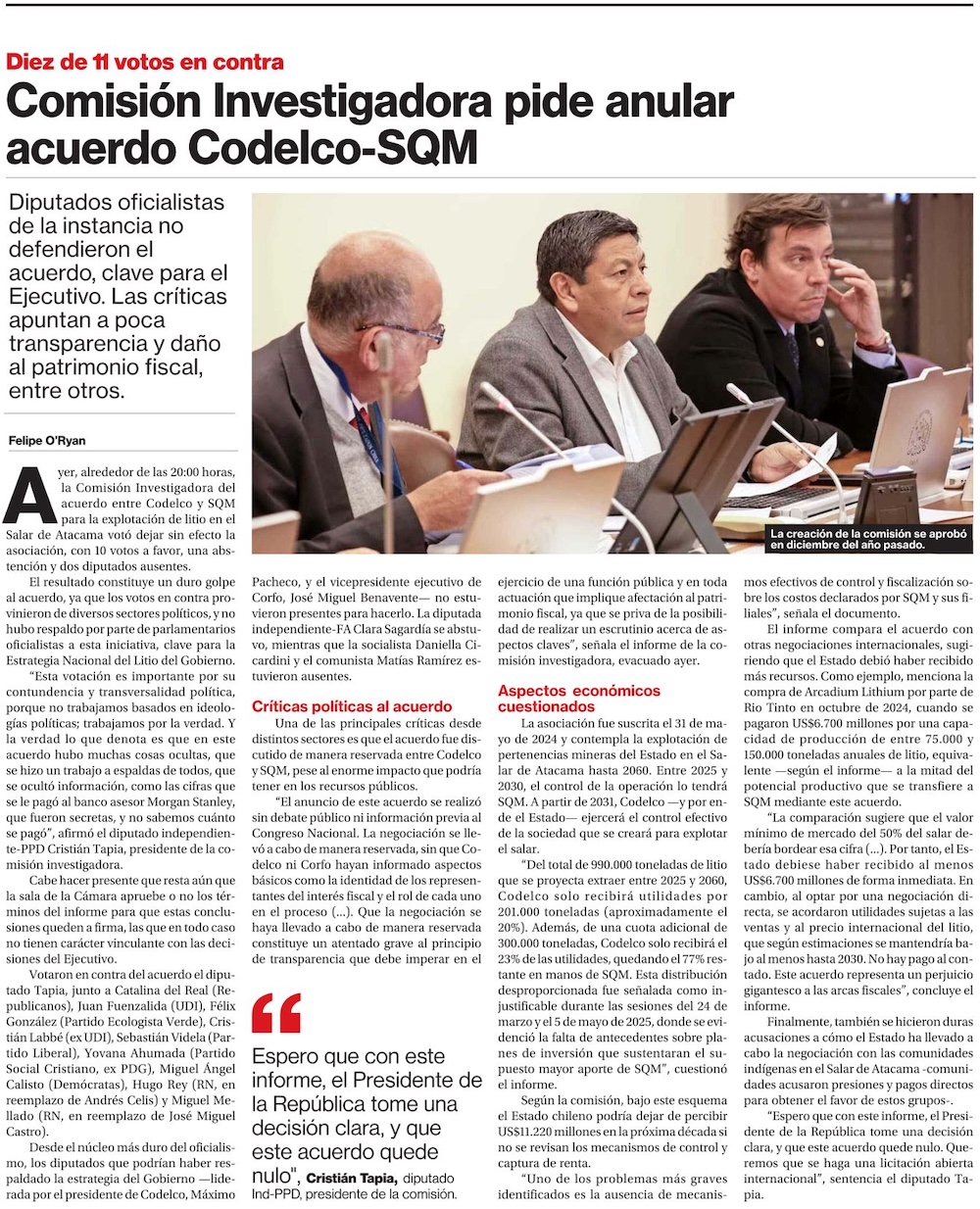 Comisión investigadora pide dejar sin efecto acuerdo Codelco-SQM - (El Mercurio de Antofagasta)