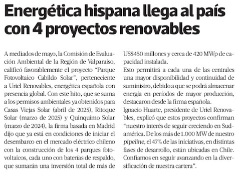 Hispana Uriel invertirá en cuatro parques solares - (El Mercurio de Santiago)