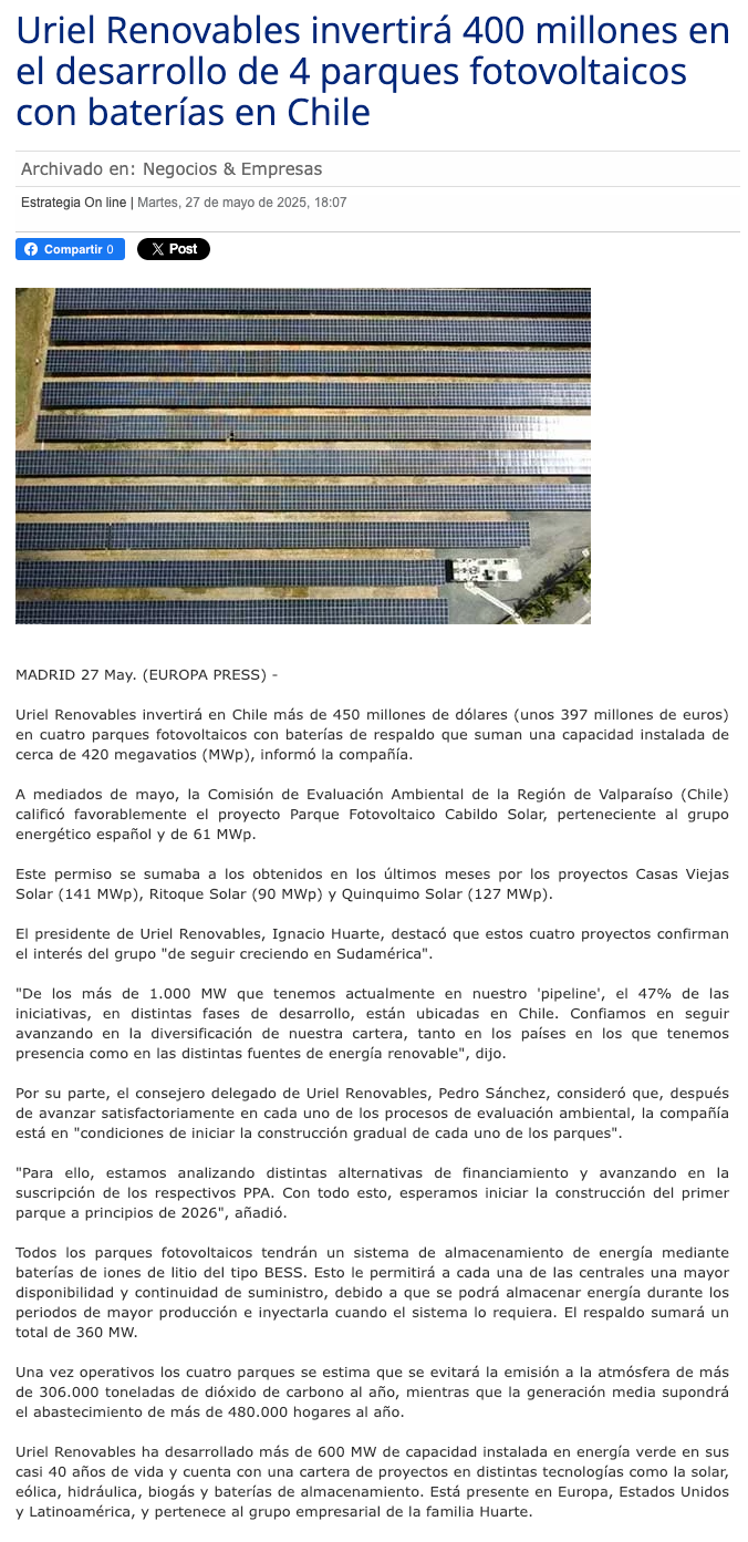 Hispana Uriel invertirá en cuatro parques solares - (El Mercurio de Santiago)