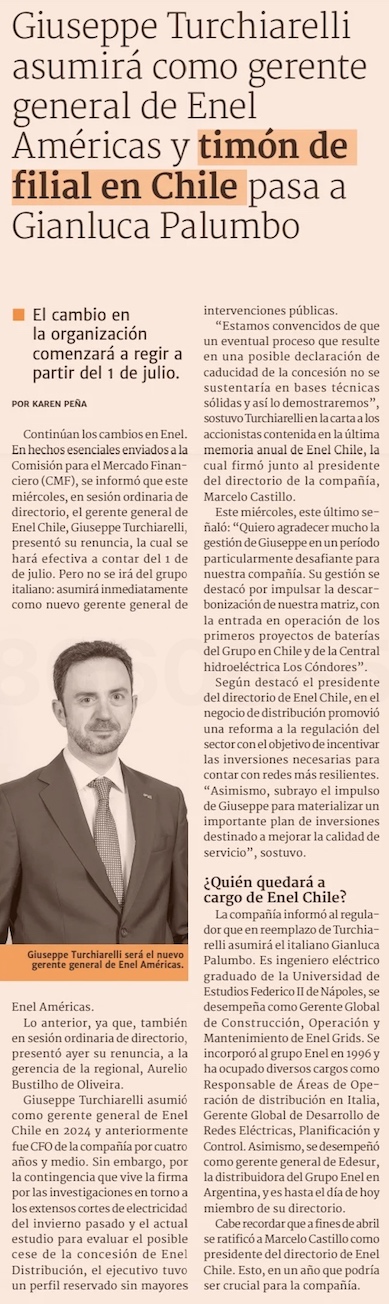Giuseppe Turchiarelli dejará la gerencia general de Enel Chile para asumir como CEO de Enel Americas - (Pulso)