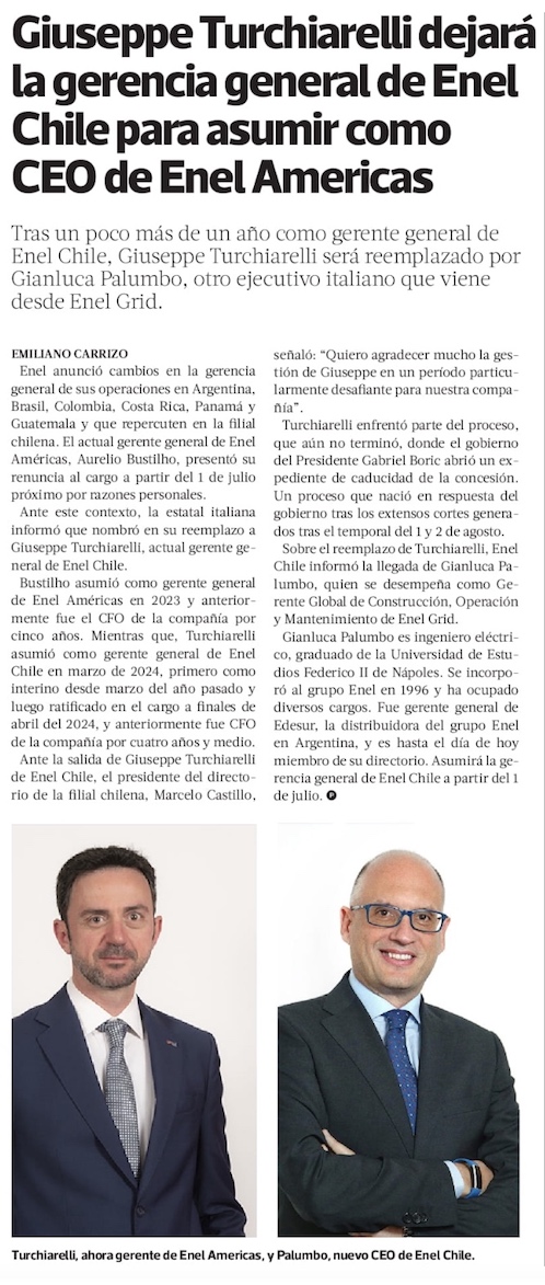 Giuseppe Turchiarelli asumirá como gerente general de Enel Américas y timón de filial en Chile pasa a Gianluca Palumbo - (Diario Financiero)