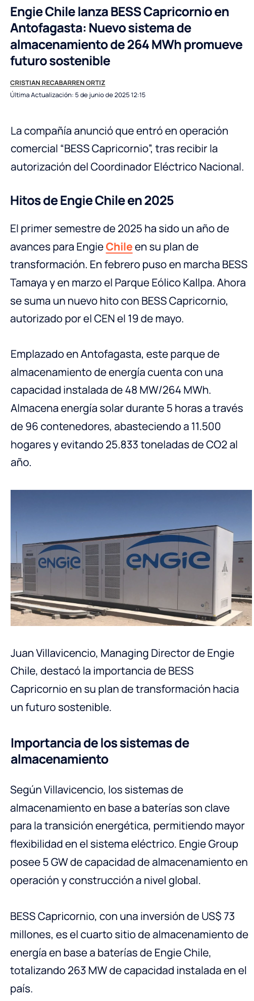 Almacenamiento: planta BESS Capricornio de Engie Chile inició operación comercial desde región de Antofagasta - (electromineria.cl)