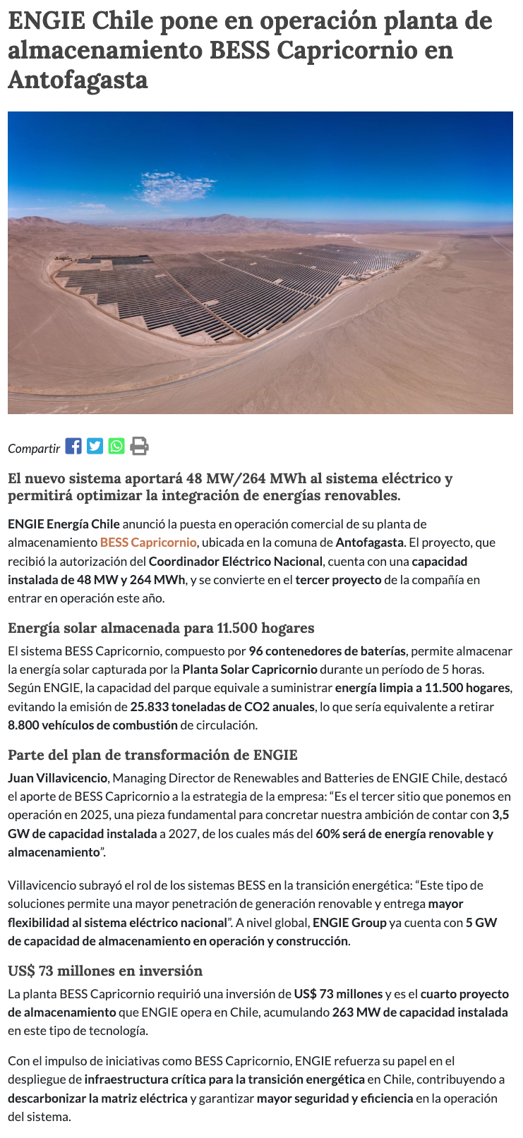 ENGIE Chile avanza en su plan de transformación con puesta en marcha de nuevo parque de baterías de almacenamiento de energía - (region2)