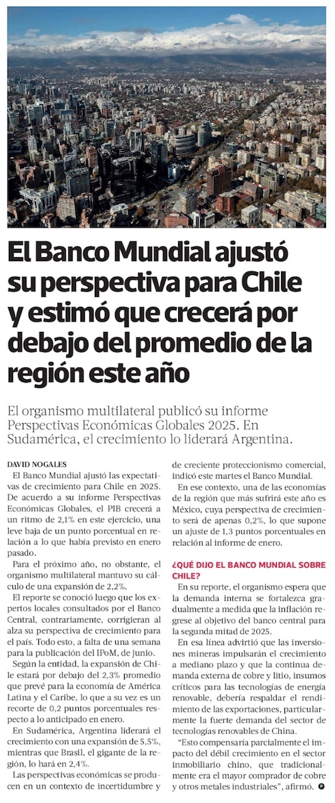 Banco Mundial recorta cálculo de crecimiento de Chile a 2,1% este año - (El Mercurio de Santiago)