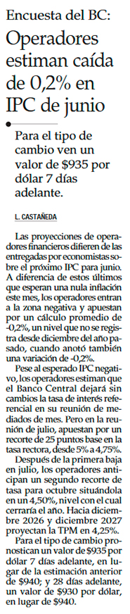Operadores financieros anticipan para junio la primera caída del IPC en el año - (Diario Financiero)