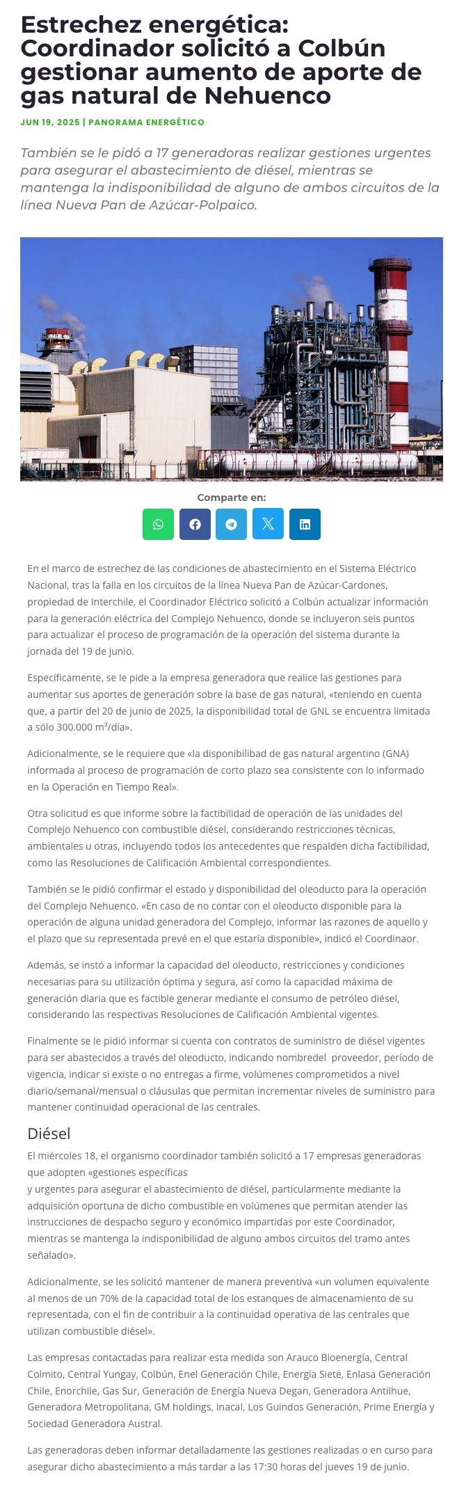 Coordinador Eléctrico reconoce “estrechas” condiciones de abastecimiento y exige a centrales asegurar suministro de diésel - (eldinamo)