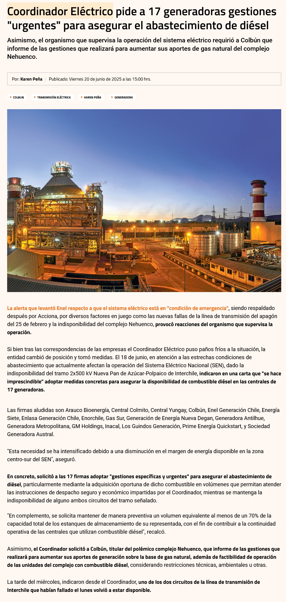 Estrechez energética: Coordinador solicitó Colbún gestionar aumento de aporte de gas natural de Nehuenco - (electromineria.cl)