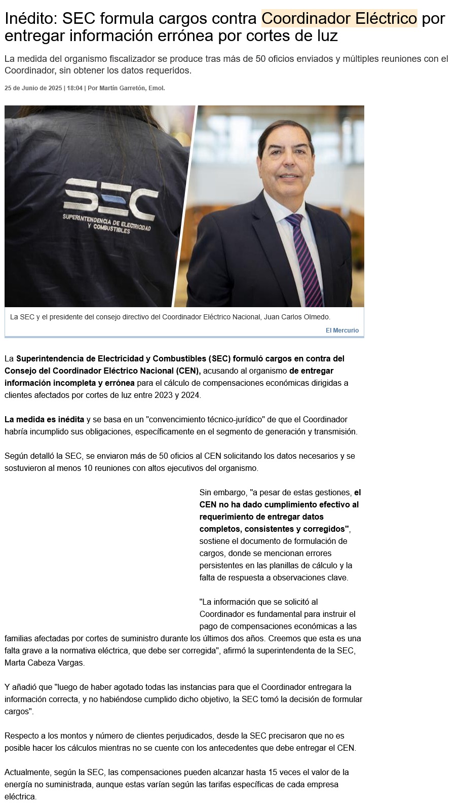 SEC formula cargos contra directorio del Coordinador Eléctrico por falta de información en informes sobre cortes de luz - (cnnchile.com)