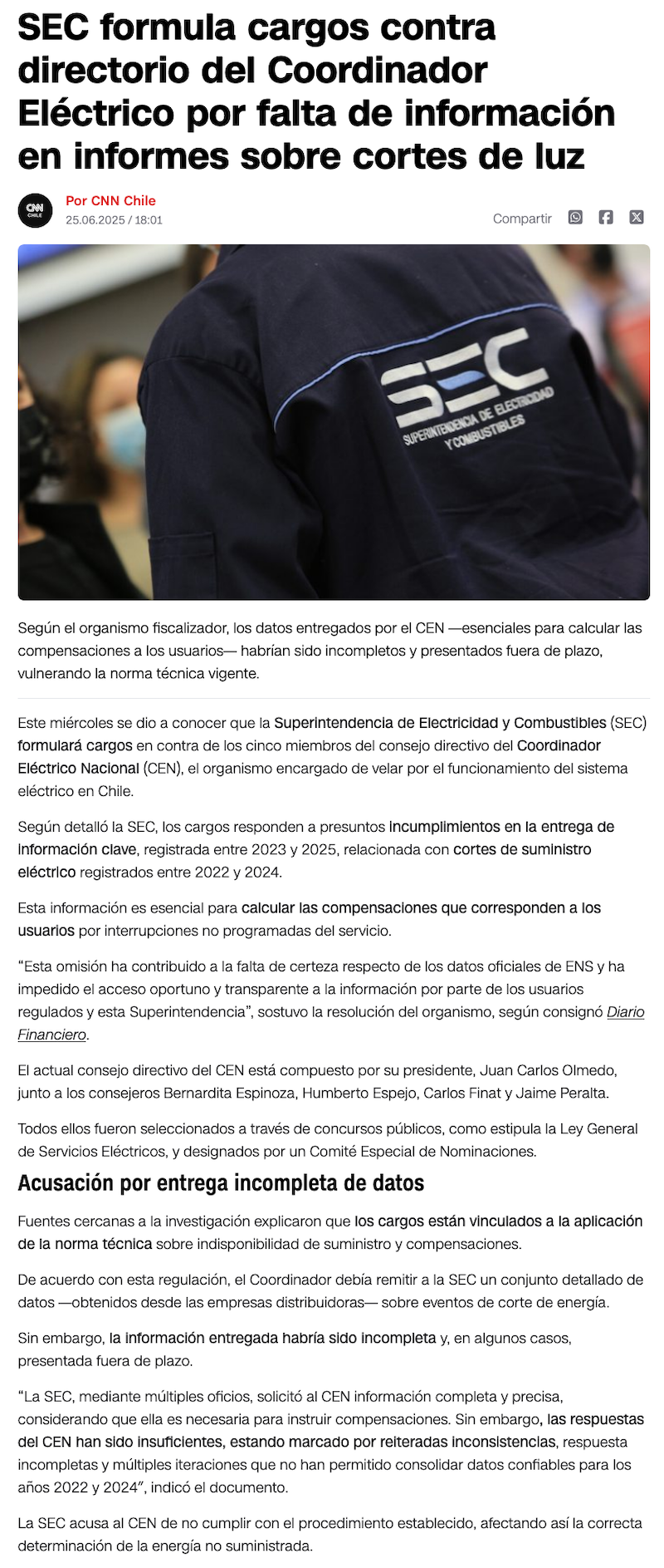 SEC formula cargos contra el Coordinador Eléctrico Nacional por información incompleta y errónea de cortes de luz - (puranoticia.cl)