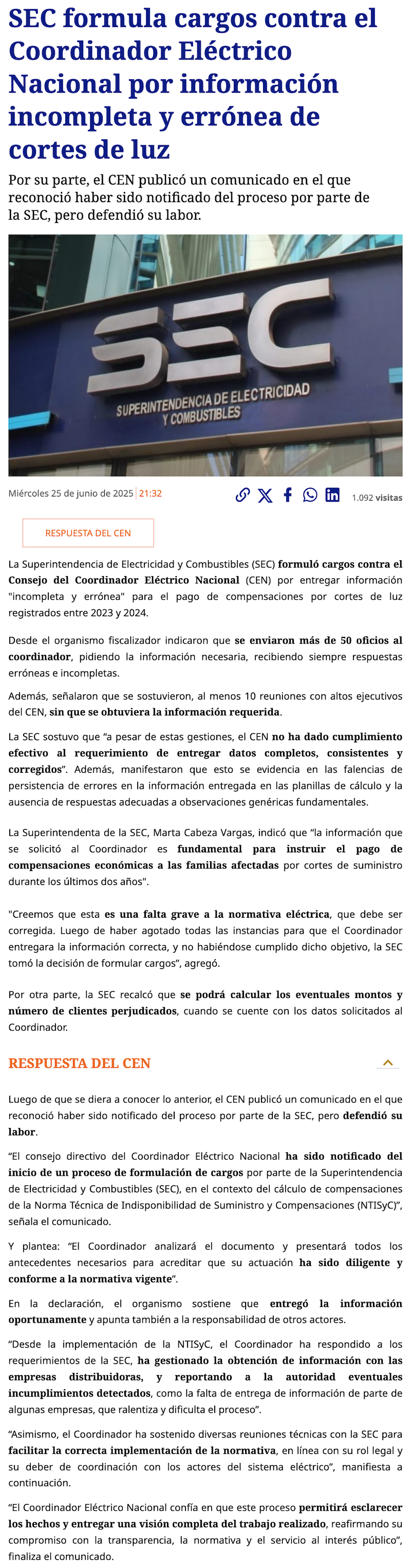 SEC formula cargos contra directorio del Coordinador Eléctrico por falta de información en informes sobre cortes de luz - (cnnchile.com)