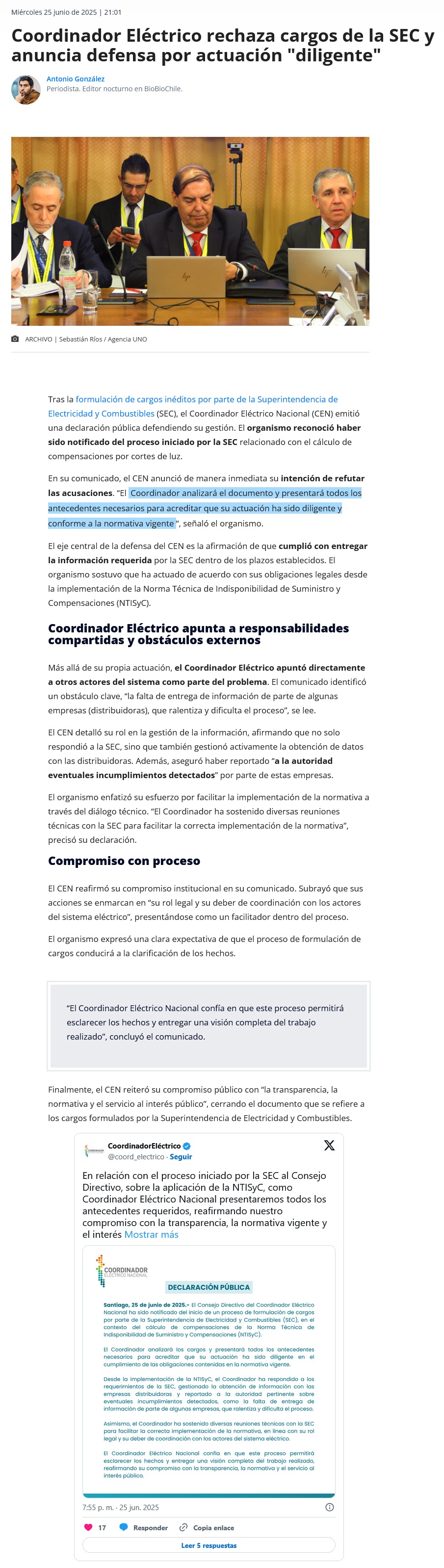 Coordinador Eléctrico Nacional emite declaración pública respecto a cargos formulados por la SEC - (revistaei.cl)
