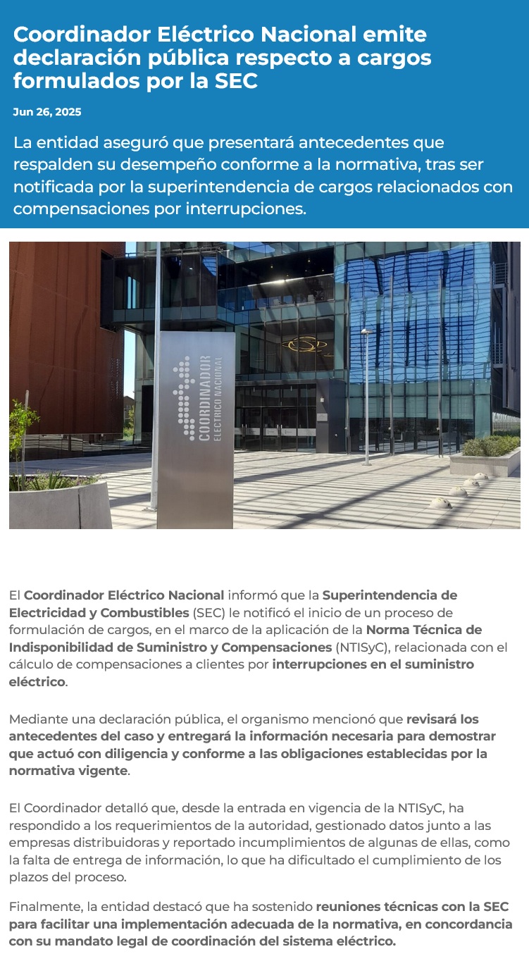 Consejo del Coordinador Eléctrico Nacional sale en respuesta a los cargos que le formuló la SEC por diferentes errores que habrían cometido - (g5noticias.cl)