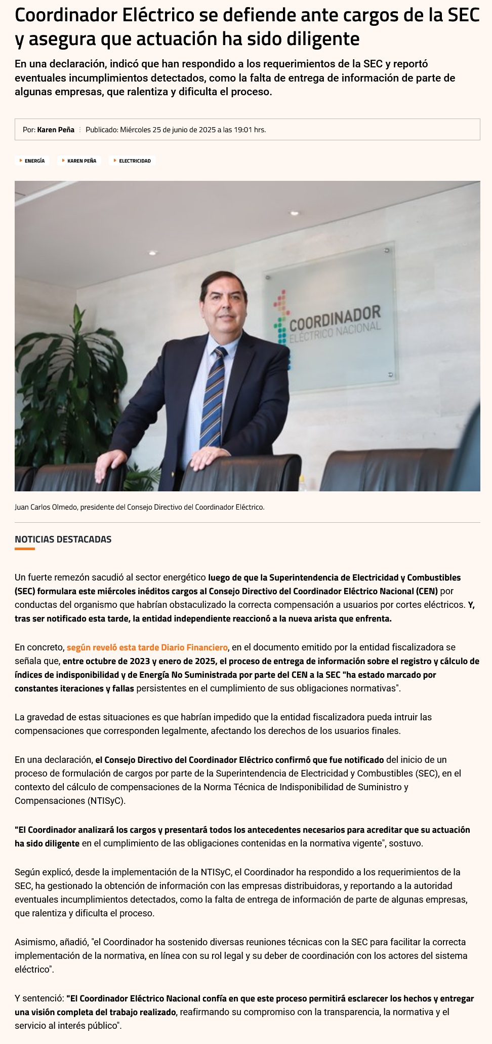 Coordinador Eléctrico Nacional emite declaración pública respecto a cargos formulados por la SEC - (revistaei.cl)