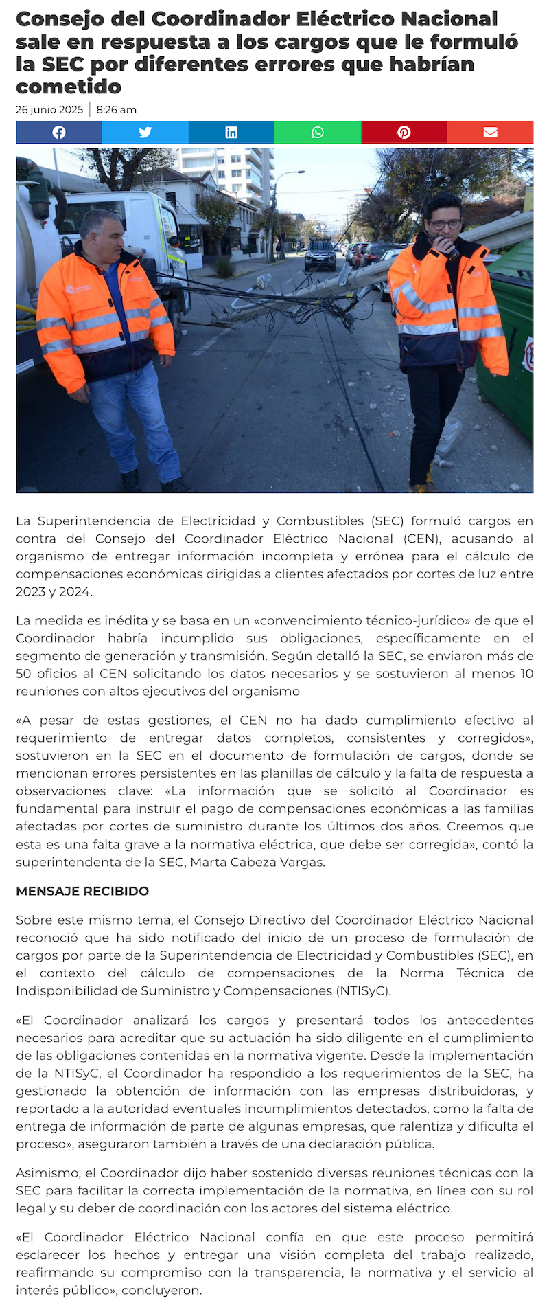 Coordinador Eléctrico Nacional emite declaración pública respecto a cargos formulados por la SEC - (revistaei.cl)