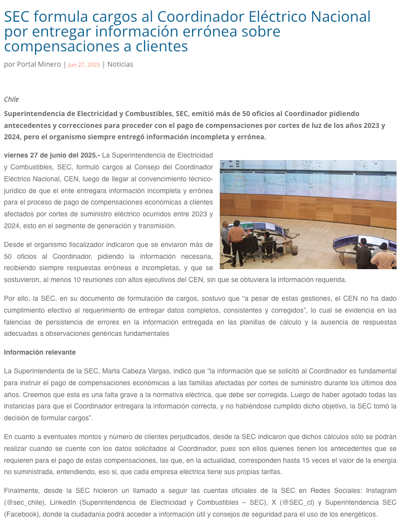 Por información incompleta y errónea sobre los cortes de luz: SEC formula cargos contra el Coordinador Eléctrico - (duna.cl)