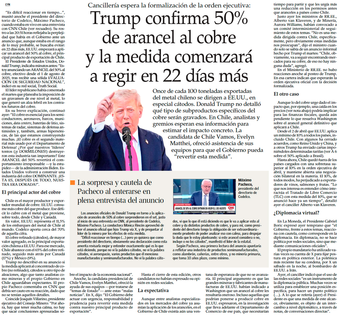 Trump confirma aranceles de 50% al cobre: “EEUU volverá a construir una industria dominante” - (Diario Financiero)