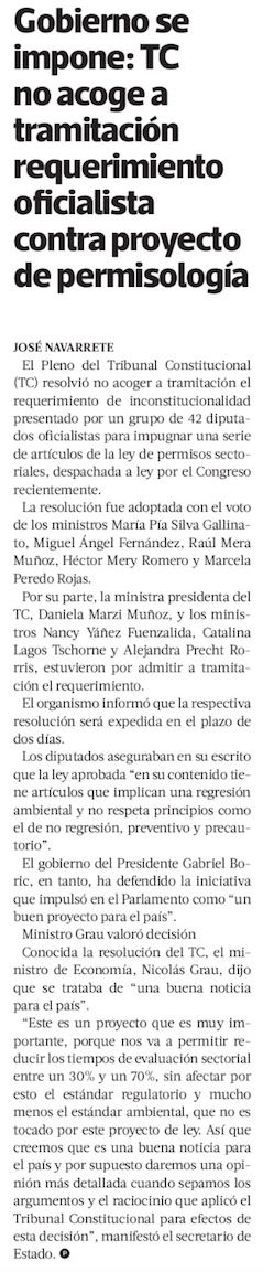 Gobierno se impone a diputados del oficialismo: TC desestima impugnación a ley de permisos - (Diario Financiero)