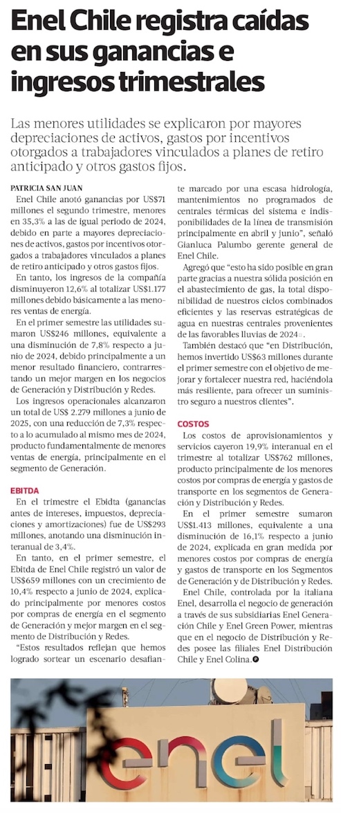 Utilidades e ingresos de Enel Chile caen en el primer semestre - (Diario Financiero)