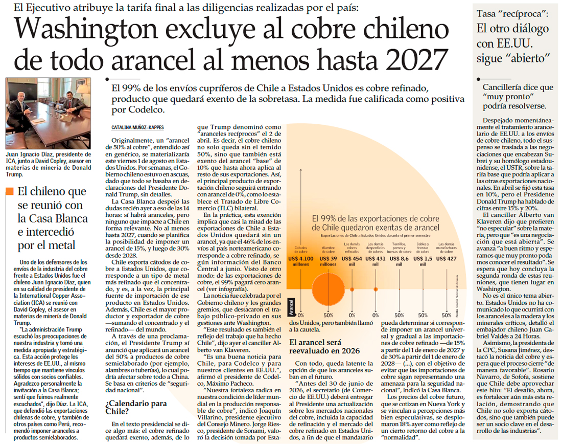 Trump opta por el realismo y excluye al cobre refinado del arancel del 50%, pero revisará su estatus en 2026 - (Diario Financiero)