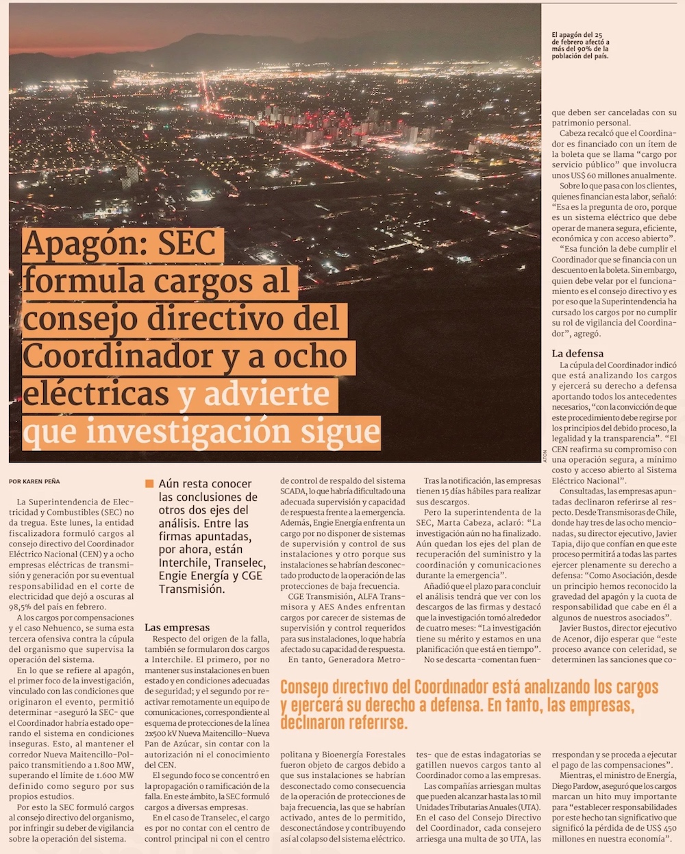 SEC formula cargos al consejo directivo del Coordinador Eléctrico y a ocho empresas por apagón del 25 de febrero - (Pulso)