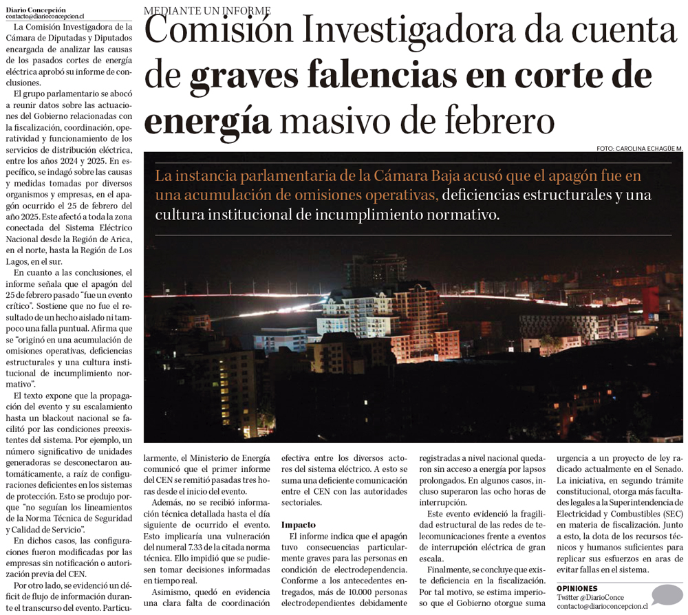 Comisión investigadora de diputados sobre apagón masivo de febrero detalla falencias y propone mejoras - (induambiente.cl)