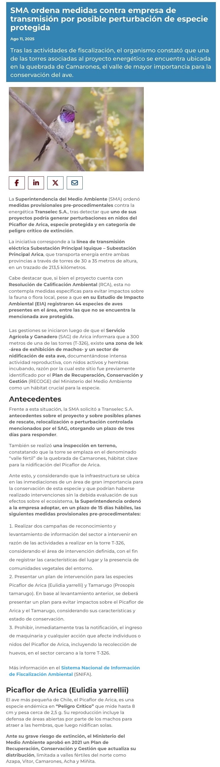 SMA ordena medidas contra Transelec por posible perturbación del Picaflor de Arica - (electromineria.cl)