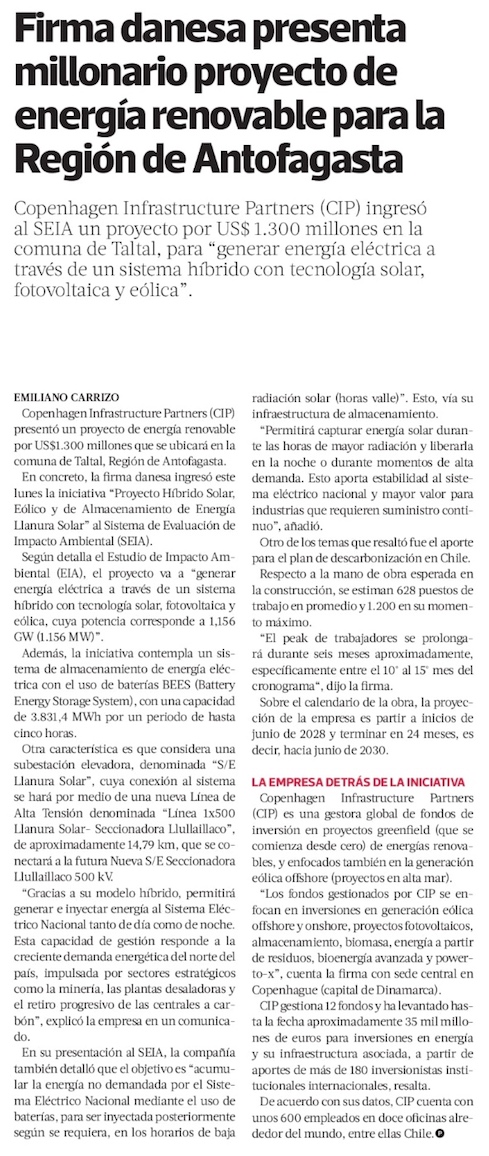 Fondo danés ingresa al SEIA proyecto solar y eólico por US$ 1.300 millones - (El Mercurio de Santiago)