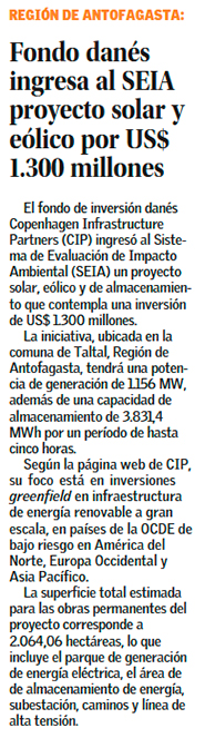 Firma danesa presenta a evaluación megaproyecto solar y eólico en Taltal - (El Mercurio de Antofagasta)