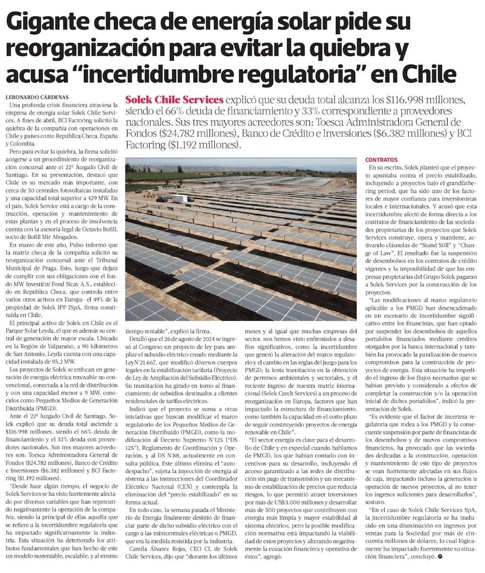 Gigante checa de energía solar pide su reorganización para evitar la quiebra y acusa “incertidumbre regulatoria” en Chile - (La Tercera Online)