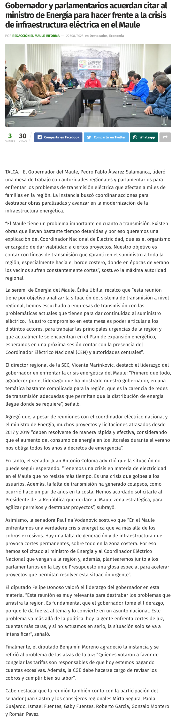 Gobernador y parlamentarios acuerdan citar al ministro de Energía para hacer frente a la crisis de infraestructura eléctrica en el Maule - (El Heraldo (Linares))